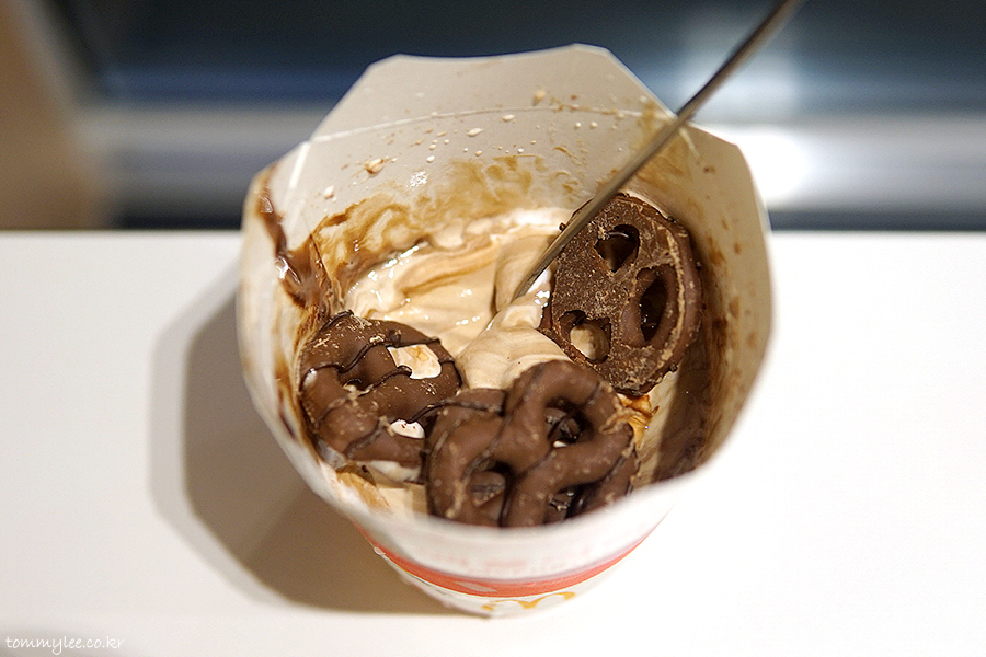 안타깝게도 허쉬 프레첼 맥플러리 전용 케이스에 안 나왔어요.. 다 떨어졌나 봄.. ㅠ.ㅠ.. 암튼 허쉬 초콜릿 소스와 바닐라 소프트 아이스크림 조합의 맥플러리고 허쉬 프레첼 토핑이 4개 올라갑니다.. 가격은 기존 초코 오레오 맥플러리가 2,500원이니까 허쉬 프레첼 토핑 하나당 100원인 셈입니다.. 합리적인 가격 설정..