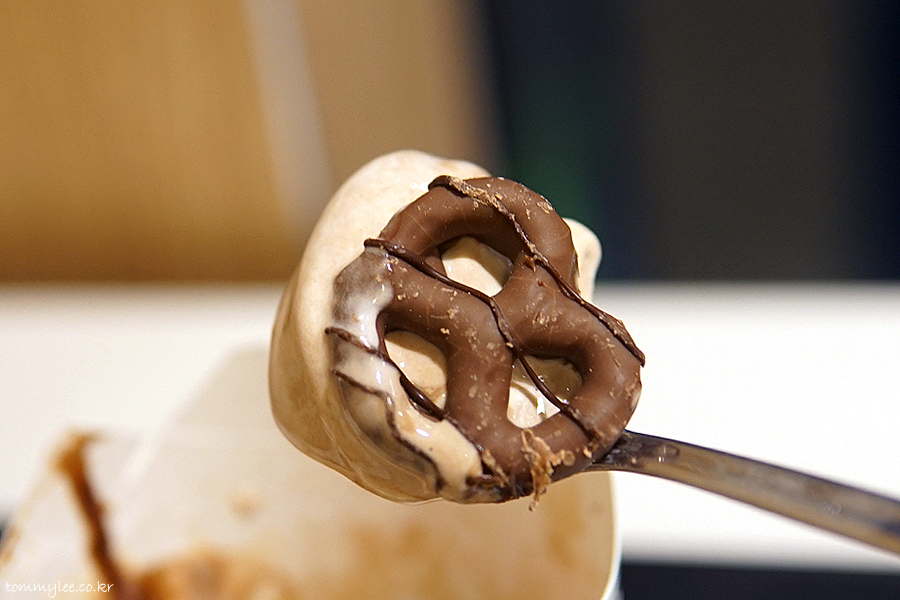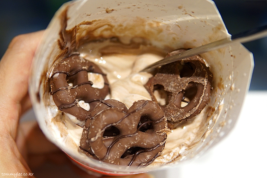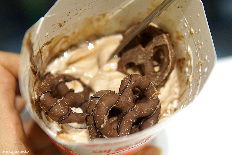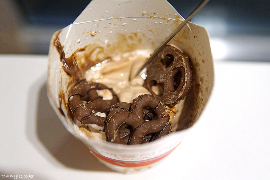 안타깝게도 허쉬 프레첼 맥플러리 전용 케이스에 안 나왔어요.. 다 떨어졌나 봄.. ㅠ.ㅠ.. 암튼 허쉬 초콜릿 소스와 바닐라 소프트 아이스크림 조합의 맥플러리고 허쉬 프레첼 토핑이 4개 올라갑니다.. 가격은 기존 초코 오레오 맥플러리가 2,500원이니까 허쉬 프레첼 토핑 하나당 100원인 셈입니다.. 합리적인 가격 설정..