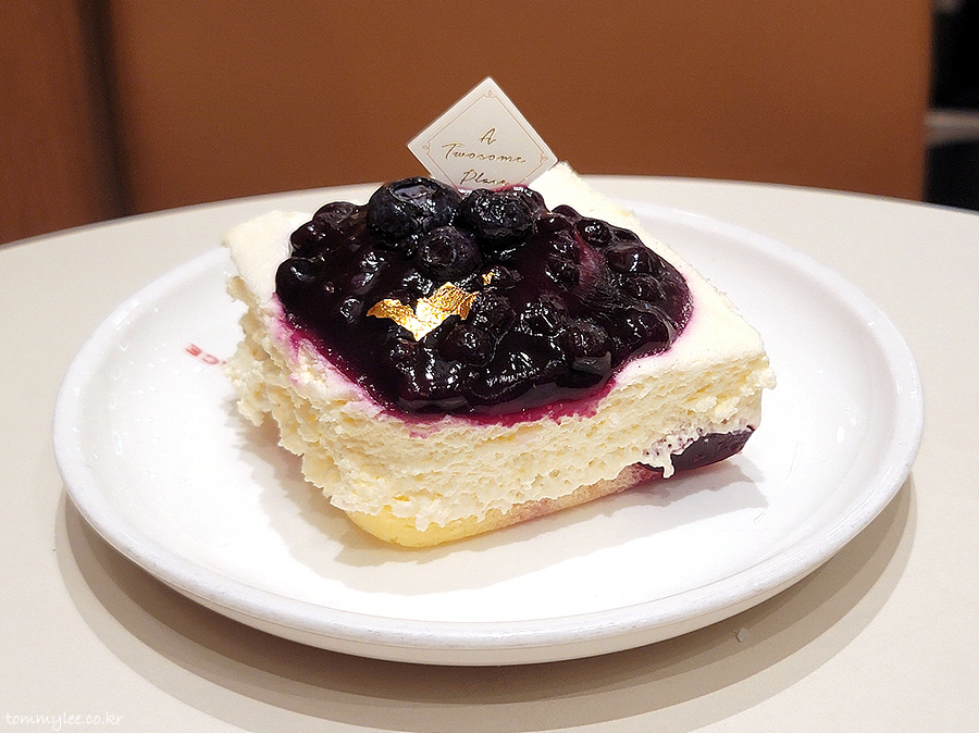 위에서 바라보면 이런 느낌.. 블루베리 잼이 잔뜩 올라가고 마름모 케익픽과 금박 장식..