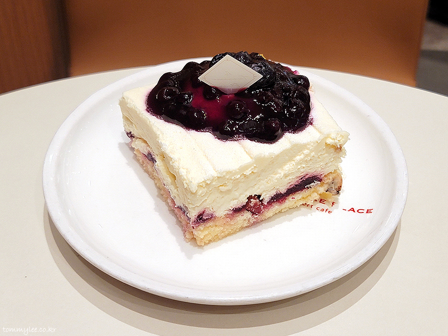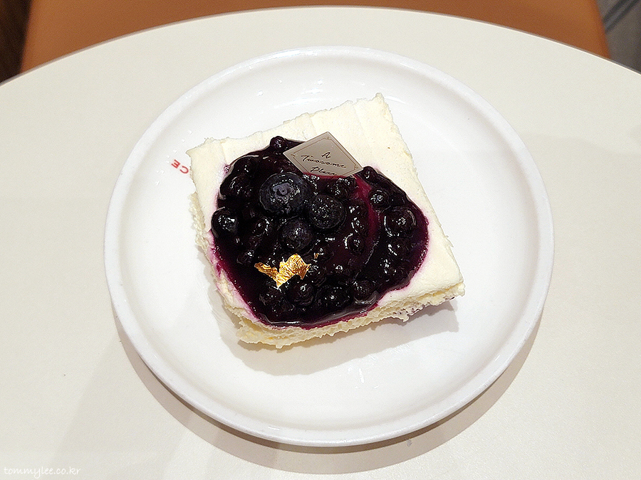위에서 바라보면 이런 느낌.. 블루베리 잼이 잔뜩 올라가고 마름모 케익픽과 금박 장식..