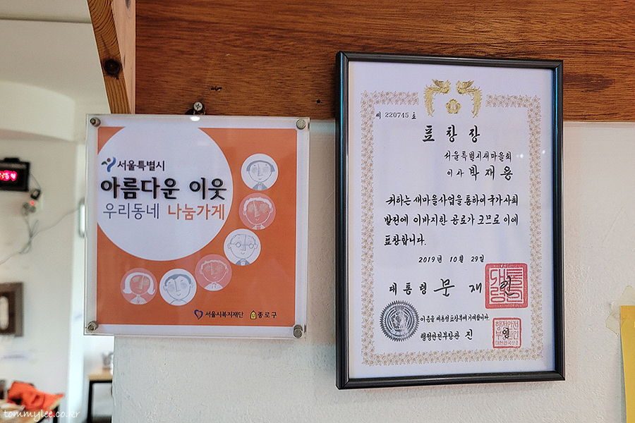 나오는데 지인분께서 이거 웃기다고 찍으라고.. 먹쉬돈나가 문재인 대통령 표창장을 받았어?? 오오~ 이랬는데??.. 맛집으로 받은 게 아니라 새마을운동(--)으로 받은 거네요.. 문재인 X 새마을운동이라니 이게 무슨 근본없는 조합인지 모르겠는데.. 흑역사 같은 기분이라 재밌긴 하네요.. 암튼 먹쉬돈나는 삼청동 하면 떠오르는 1순위 맛집이 아닐까 합니다.. 삼청동에선 먹쉬돈나 본점..