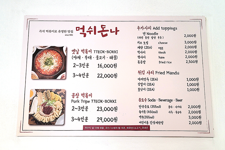 먹쉬돈나 메뉴 및 가격.. 옛날떡볶이 2~3인분 16,000원, 3~4인분 22,000원 / 곱창떡볶이 2~3인분 23,000원, 3~4인분 29,000원 / 추가사리 : 라면 쫄면 당면 우동 2,000원, 치즈 3,000원, 계란2개 2,000원, 떡사리 2,000원, 햄사리 2,000원, 볶음밥 2,500원 / 튀김사리 : 야끼만두 1,000원, 김말이 1,000원, 못난이 1,000원..