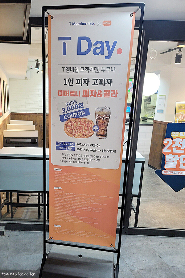 7월에 이어 8월에도 고피자가 T멤버십 T데이 행사에 참여한 관계로 어쩔 수 없이 쿠폰 쓰러 고피자에 다녀왔네요.. 피자+콜라 3천원은 진짜 안 먹으면 손해인지라..