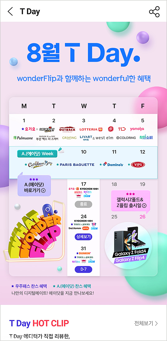 T데이 8월 넷째주 참여 브랜드는 교촌치킨, 뚜레쥬르, 배스킨라빈스, 달콤커피 그리고 고피자.. 배스킨라빈스 쿼터 40%할인이랑 고피자 피자콤보 3천원은 진짜 참을 수가 없다고 막.. ㅋㅋㅋ..
