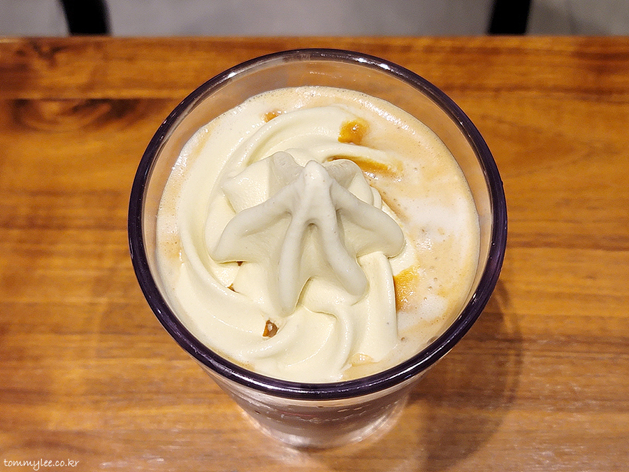 귀리우유를 사용한 아이스 오트 카페라테에 이번 시즌 아이스크림인 피스타치오 아이스크림을 올린 계절 한정의 아이스크림 카페라떼.. T멤버십 50%할인으로 4,050원..