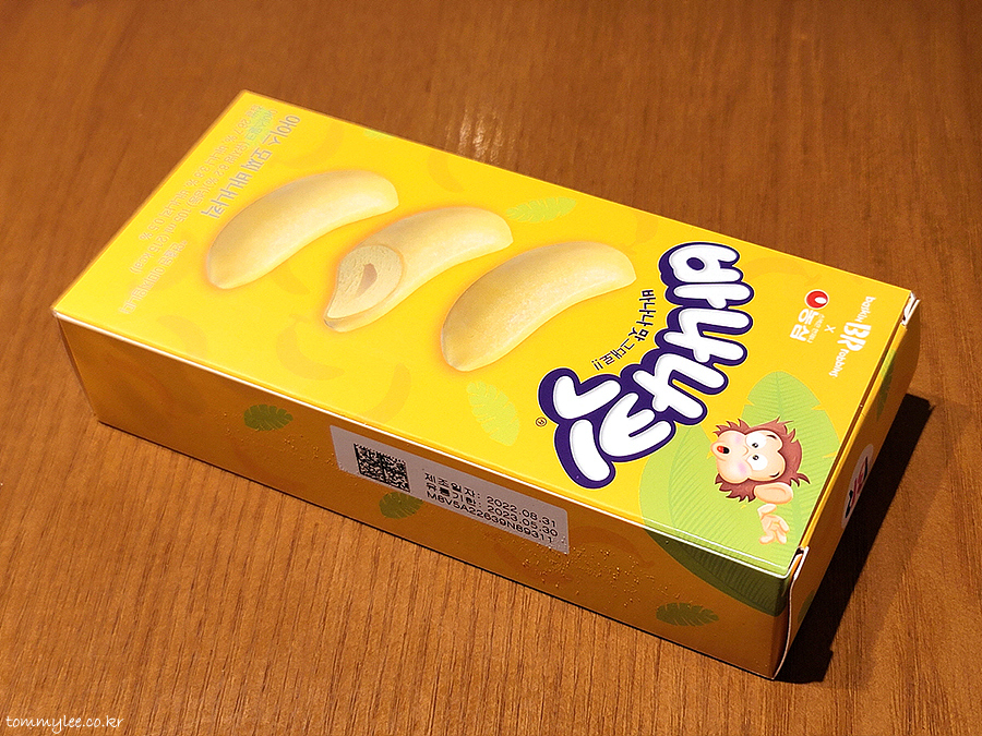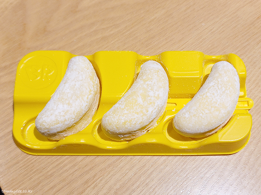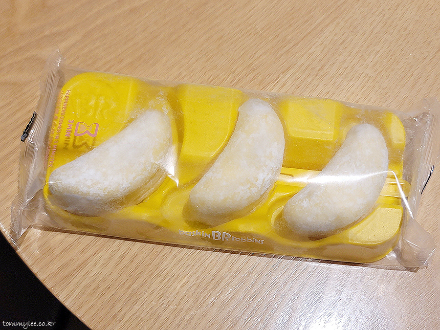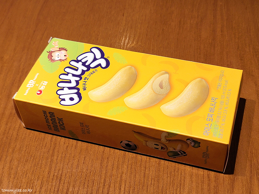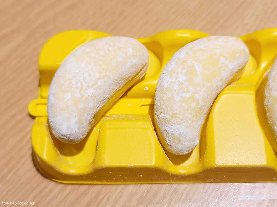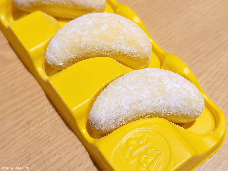 바나나킥 아이스크림에 바나나 리본이 둘러져 있고요 이걸 찹쌀떡으로 감쌌네요.. 찰떡 아이스 고급 버젼으로 보시면 될 듯..