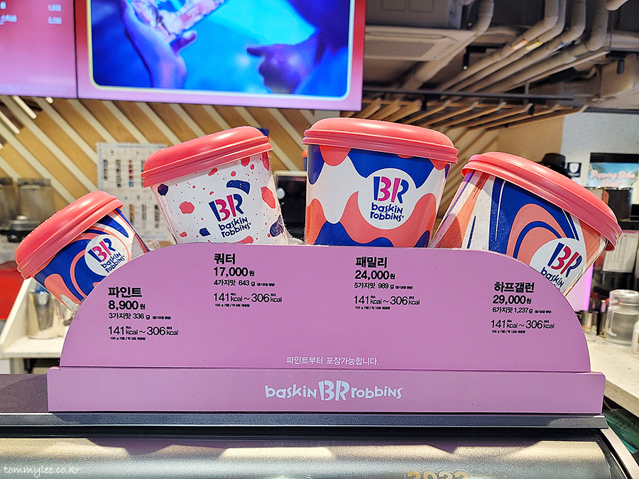 배스킨라빈스 파인트~하프갤런 가격은 위와 같고요.. 매장에서 가볍게 먹고 갈 수 있는 콘/컵 가격은 싱글레귤러 3,500원, 싱글킹 4,300원, 더블주니어 4,700원, 더블레귤러 6,700원입니다..