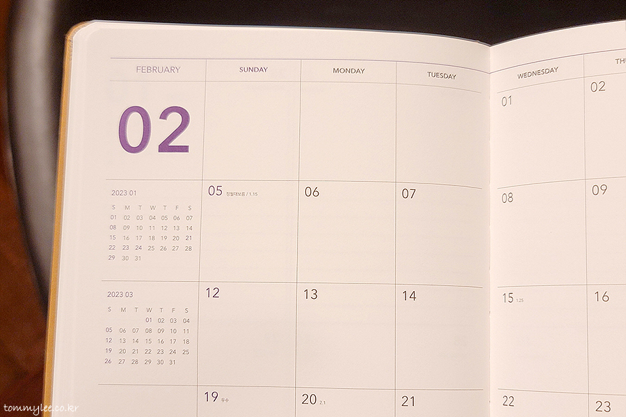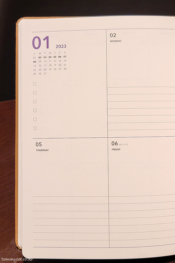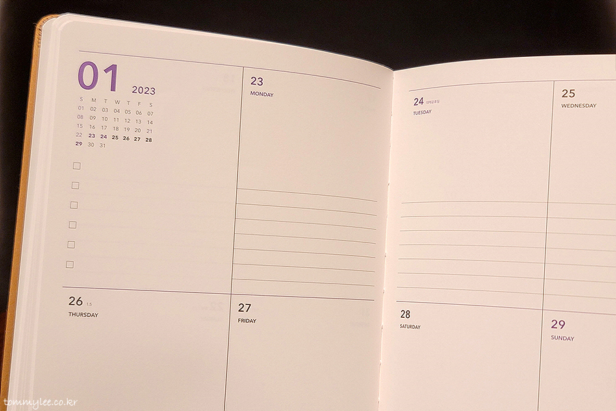 어쨌거나 본격적으로 커피빈 2023 플래너를 살펴보기로 합니다.. 누렁이 커버에 보라색 글씨고요..