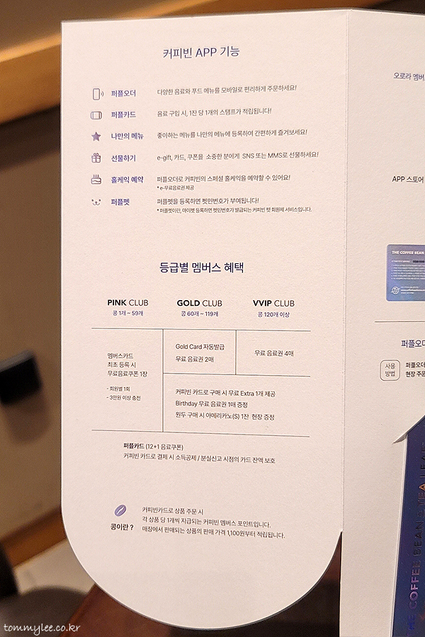 왼쪽에는 커피빈앱 기능, 커피빈 멤버스 등급별 혜택이 나와 있는데 뭐 중요한 내용은 아니겠습니다.. 기존 멤버십 혜택과 오로라 멤버스 혜택은 중복가능입니다.. 오로라 멤버스 카드로 원두 구매 한번 해봐야겠네요..