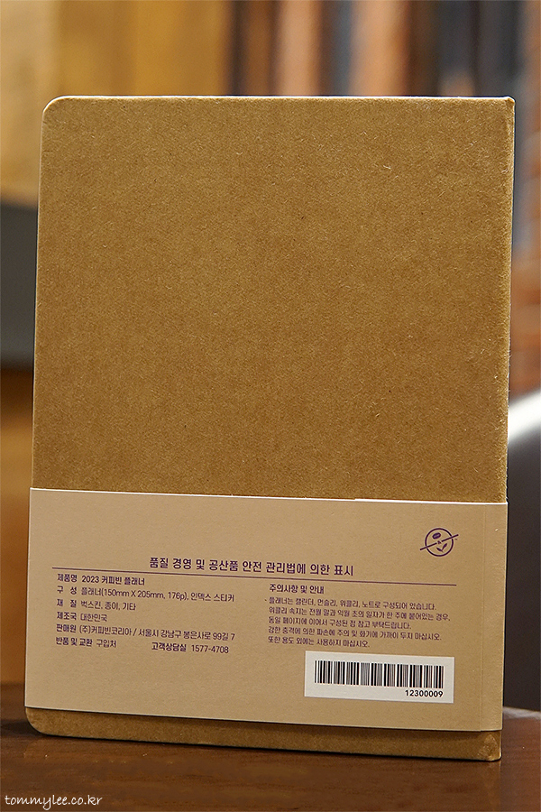 제품명 : 2023 커피빈 플래너, 구성 : 플래너 & 인덱스 스티커.. 사이즈 : 150mm*205mm, 176p, 재질 : 벅스킨, 종이, 기타.. 제조국 : 대한민국.. MADE IN KOREA 굿굿~..