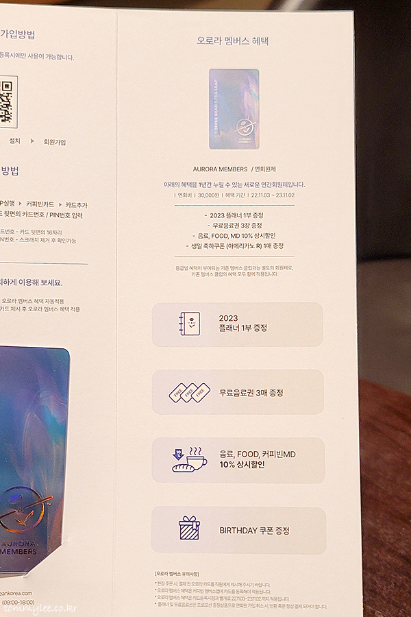 연회원제 오로라 멤버스 혜택.. 2023 플래너 1부 증정, 무료음료권 3장 증정, 10% 상시할인, 생일축하 아메리카노 쿠폰 1매 증정 혜택이 있다고 합니다..