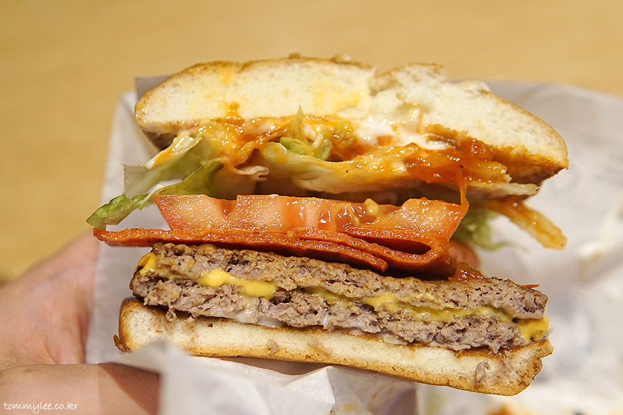 페퍼로니 피자 버거 커팅해보면 요런 느낌.. 토마토 아래 페퍼로니가 들어간 모습 확인할 수 있네요.. 거의 FM대로 잘 만든 버거입니다..