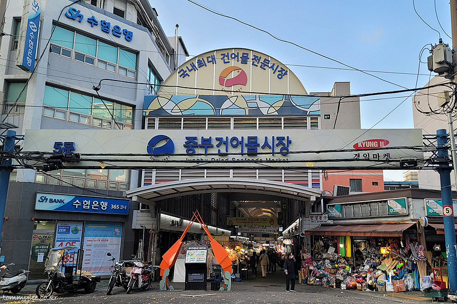 국내최대 건어물 전문시장 중부시장 바로 맞은편에 오장동 흥남집이 자리하고 있답니다.. 시장입구 바로 앞이라 정말 찾기 쉬워요.. 을지로4가역 5분 거리로 교통편도 괜찮은 편..