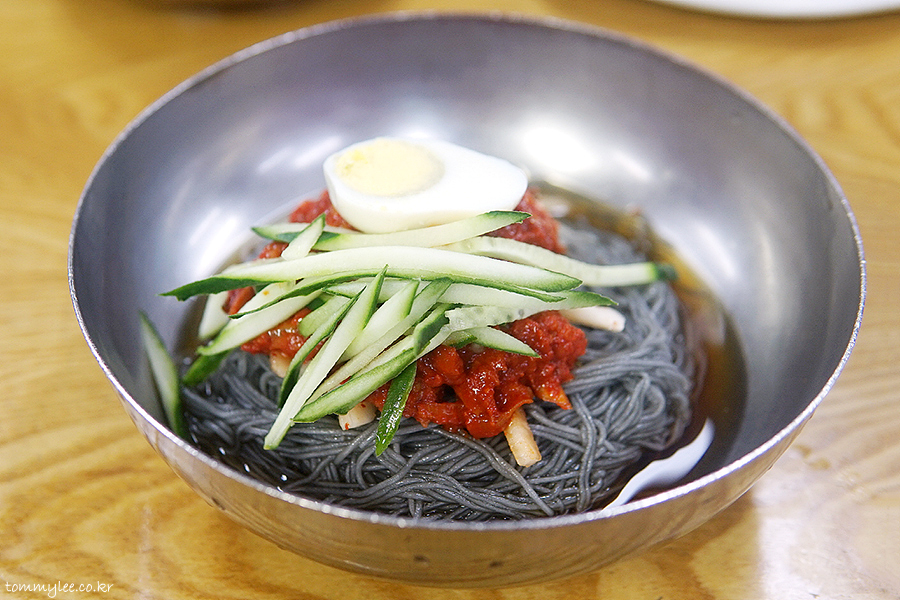 잿빛을 내는 함흥냉면 특유의 면과 함께 고소한 참기름냄새가 코를 자극합니다..