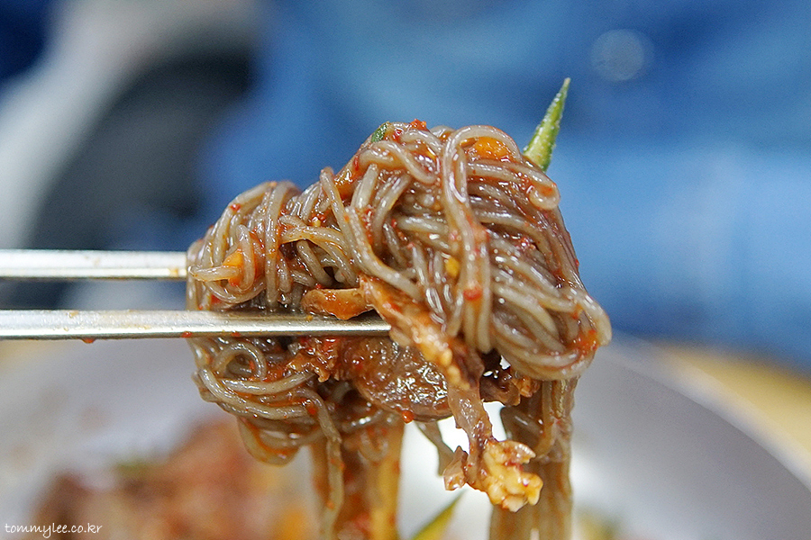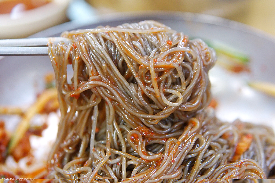 비벼보면 이런 느낌.. 끊어질 듯하다가도 안 끊기는 함흥냉면 특유의 탄력면발 좋습니다.. 함흥냉면은 평양냉면의 메밀면과는 전혀 다른 이빨로 끊어 먹는 맛이 있는지라 가위로 면을 자른 후 드시면 손해입니다.. 큰 재미를 포기하는 셈이니까요..