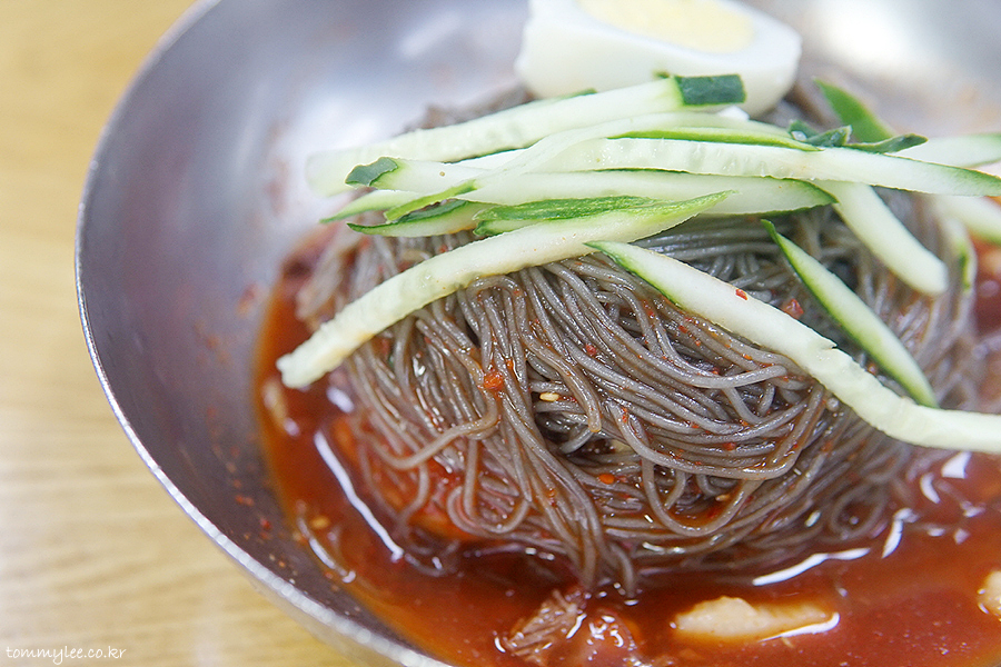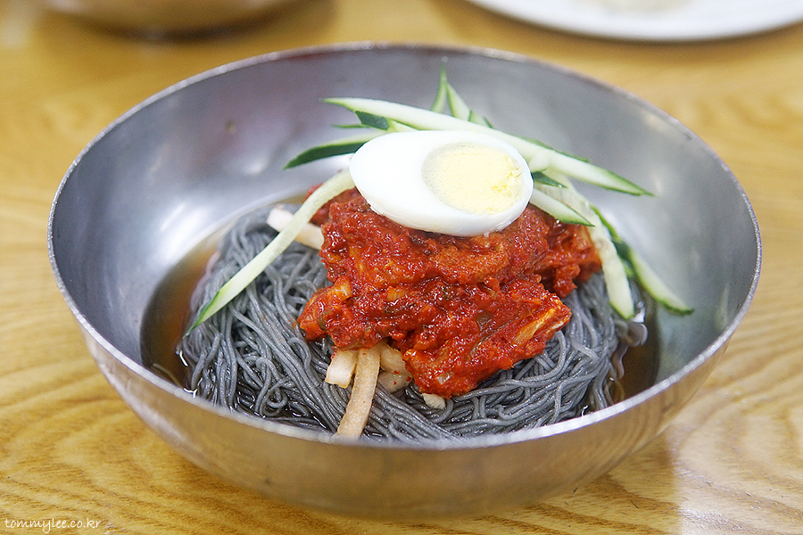맛집답게 정말 단시간에 제공된 냉면.. 너무 빨리 나와서 웃겼어요.. ㅋㅋㅋ.. 보통은 고기 고명이 돋보이게 냉면 위에 올리지만 흥남집 고기냉면 고명은 오이채와 삶은 달걀뿐이고 고기는 면 아래에 깔려 나옵니다.. 이게 좀 특이하죠..