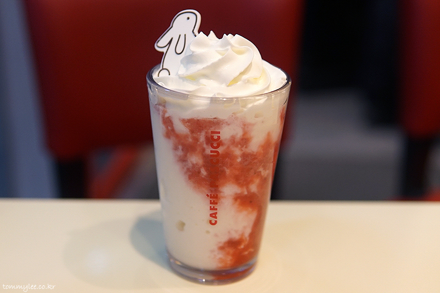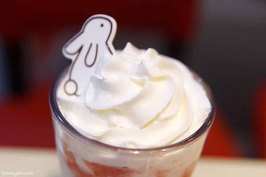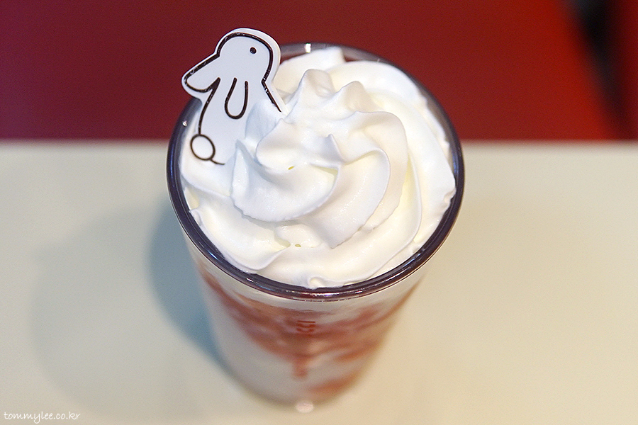 작년엔 호랑이의해라서 호랑이 줄무늬를 입힌 타이거 얼그레이 쉐이크란 기괴한 메뉴를 밀게 된지라 아쉽게도 이 딸기 밀크 쉐이크가 나오지 못했었는데요.. 2년 만의 부활.. 화이트 휘핑크림 위에 화이트 토끼 초콜릿 굿굿..