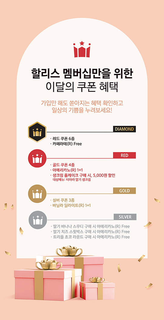 할리스 2월 등급별 쿠폰팩을 살펴보면.. 실버 : 딸기바나나스무디 구매 시 아메리카노, 딸기치즈스윗박스 구매 시 아메리카노, 트리플초코라운드 구매 시 아메리카노 / 골드 : 바닐라딜라이트 1+1 / 레드 : 아메리카노 1+1, 생크림 홀케이크 5천원할인 / 다이아 : 카페라떼 무료.. 전월에 비해 매우 좋아진 내용으로 찾아온 2월 쿠폰팩이네요..