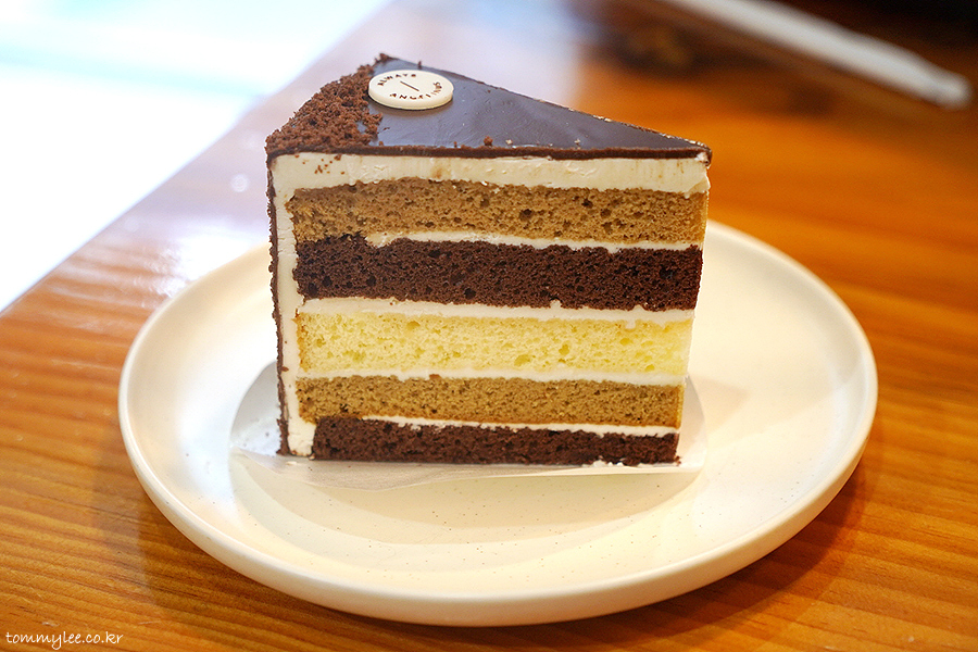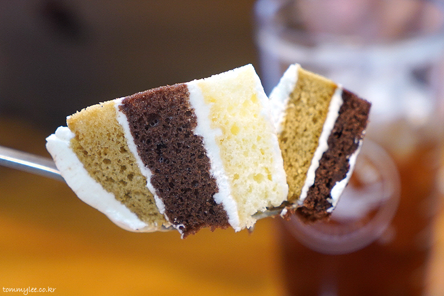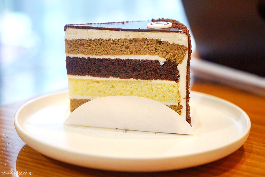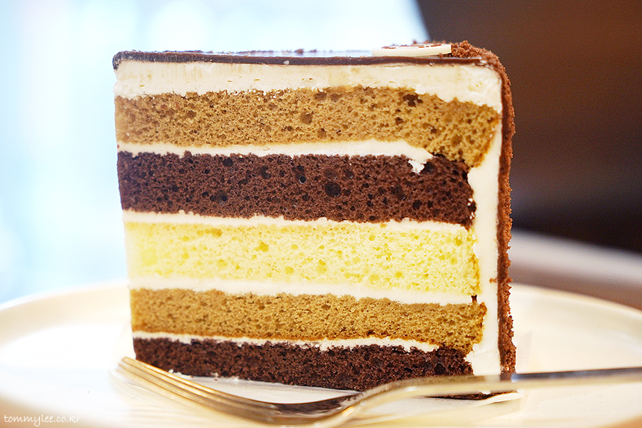 플레인, 초콜릿, 모카로 구성된 3단 그라데이션 시트에 생크림이 차곡차곡 쌓인 케이크랍니다.. 근데 케이크 상태가 그리 좋지 않더군요.. 케이크를 감싸고 있는 초콜릿이 질겨서 잘리질 않았음.. 결국 한 번에 다 떨어졌다죠..