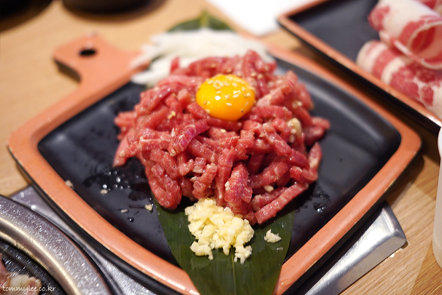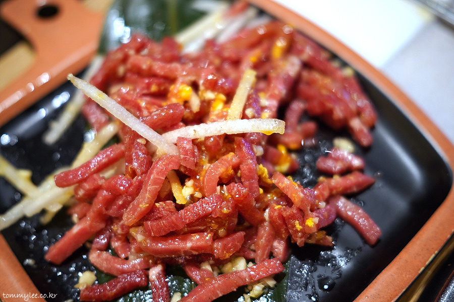 소금 간에 참기름으로 가볍게 무쳐 계란 노른자를 올려 제공.. 육회는 살짝 얼어서 사각사각하는 텍스처였어요..