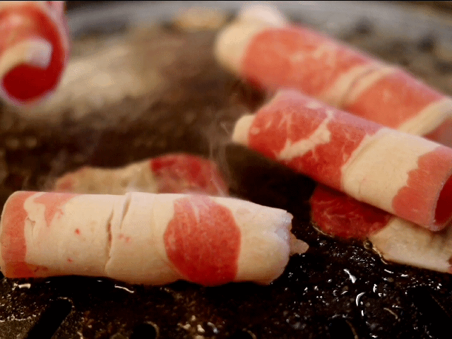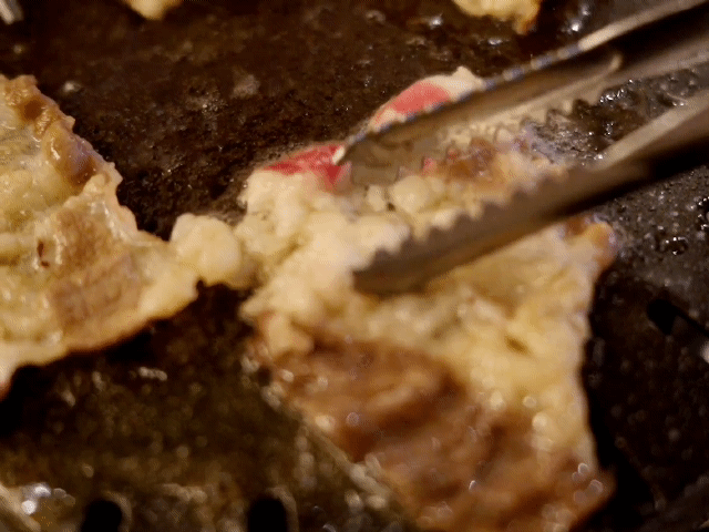 불판 위에서 지글지글 구워져 가는 차돌삼겹의 모습.. 사랑스럽네요..