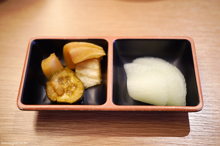 양파와 오이 장아찌하고 무초절임이 기본 찬으로 제공이 되고요..
