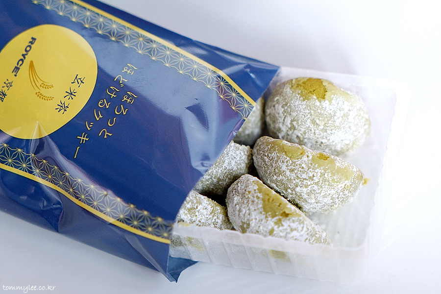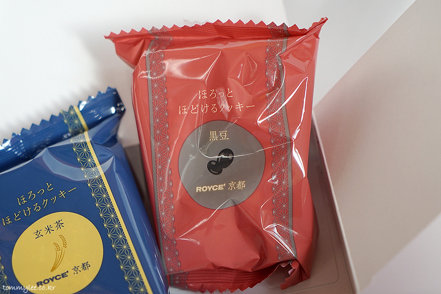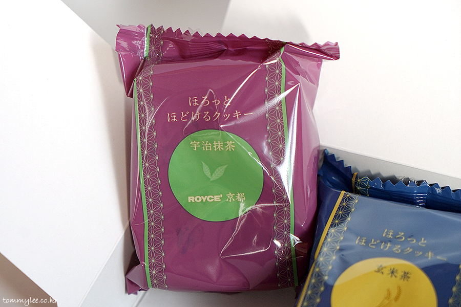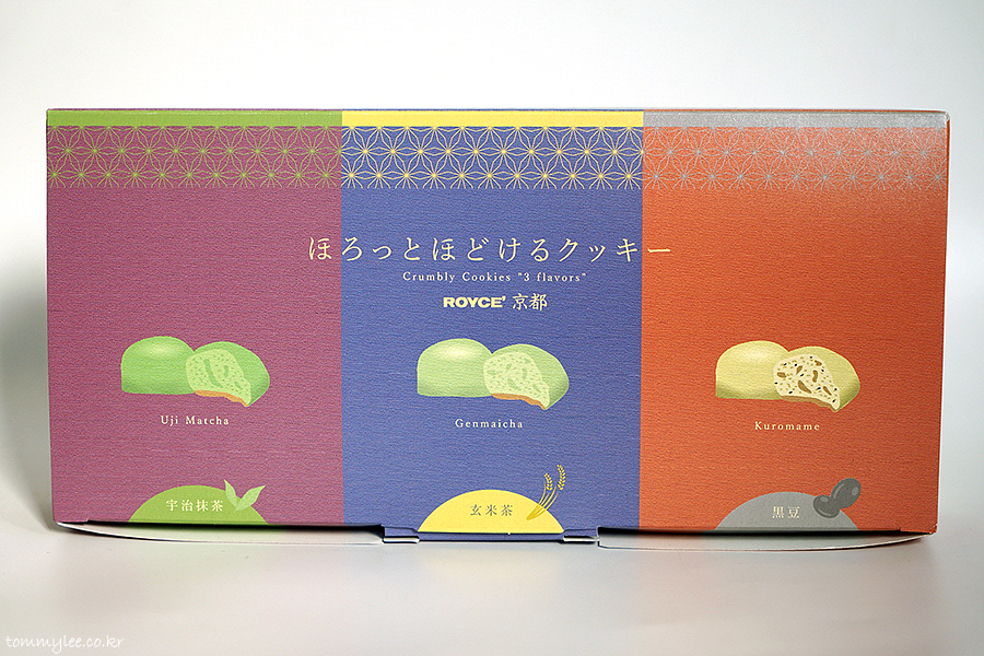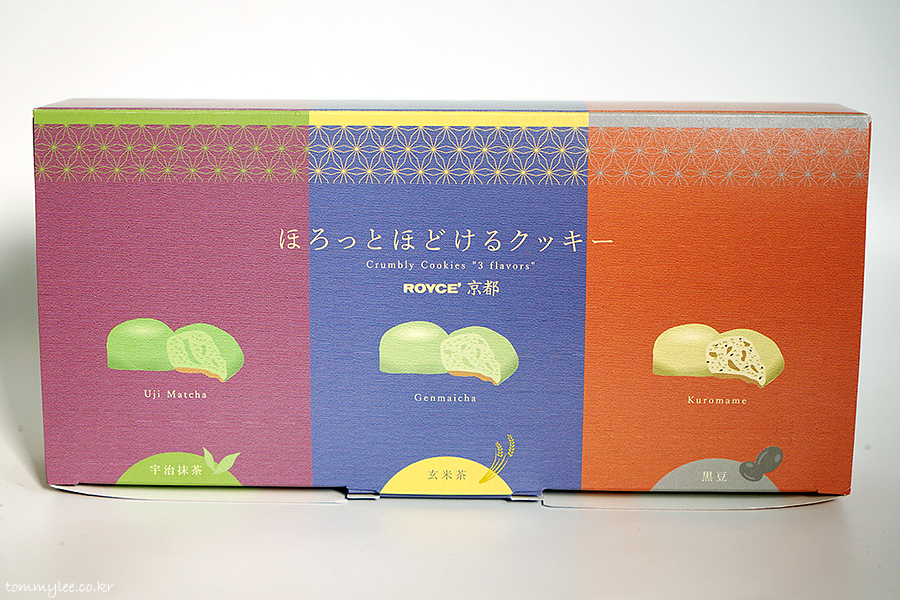 ROYCE' KYOTO.. CRUMBLY COOKIES 3 FLAVORS.. UJI MATCHA, GENMAICHA, KUROMAME.. 텍스처가 있는 패키지 고급지네요..