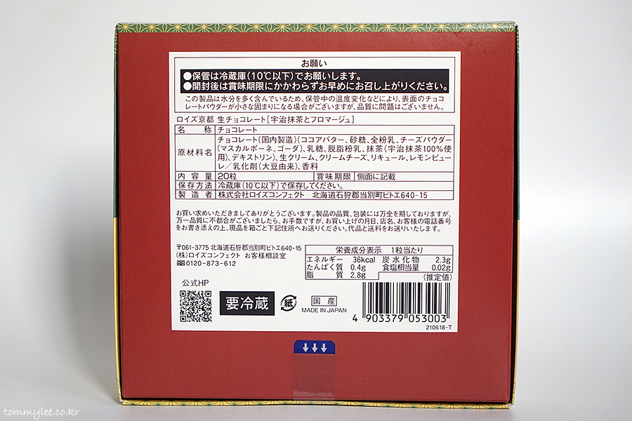 원재료 : 초콜릿 (국내제조) (코코아버터, 설탕, 전지분유, 치즈파우더 (마스카포네, 고다), 유당, 탈지분유, 말차 (우지말차100%사용), 덱스트린), 생크림, 크림치즈, 리큐르, 레몬퓌레/유화제(대두유래), 향료.. MADE IN JAPAN..