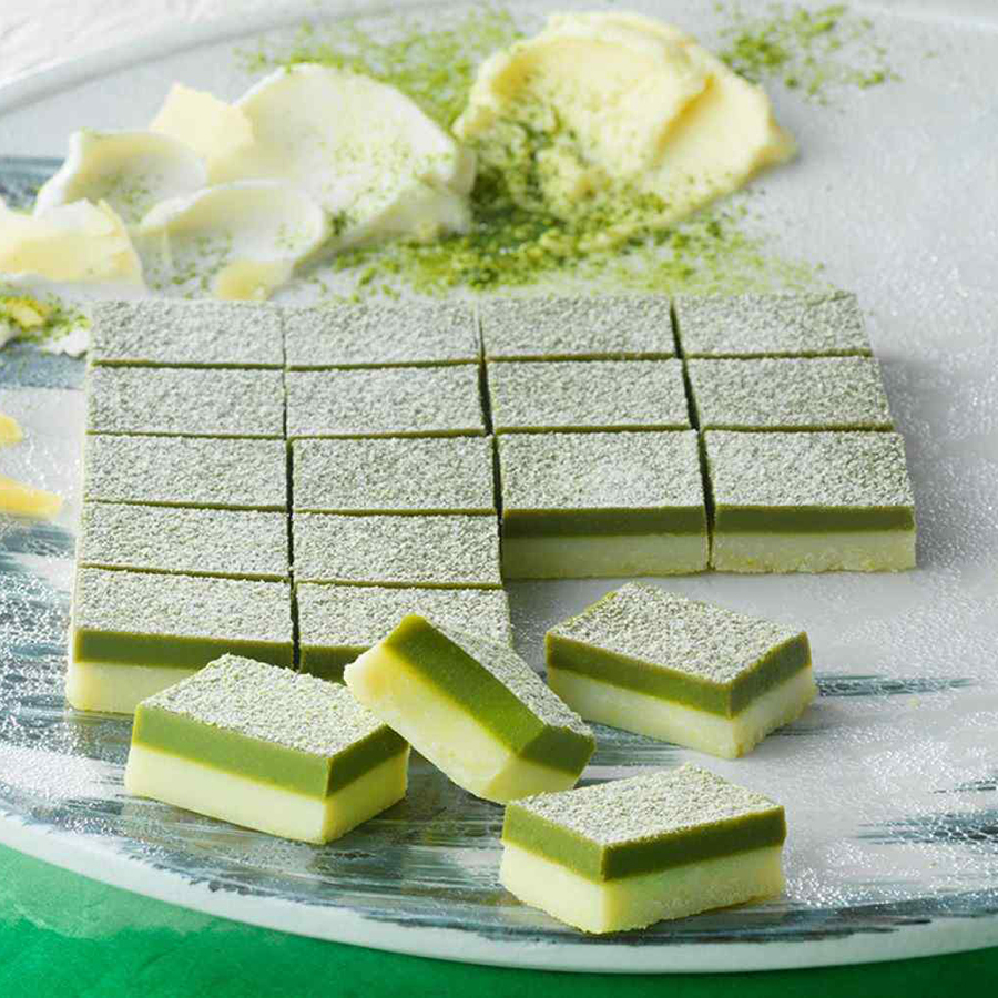 교토산 우지말차 초콜릿과 홋카이도산 3종 치즈의 프로마주 초콜릿을 같이 담아냈습니다.. 2단 레이어드의 콘스라스트형 생 초콜릿..