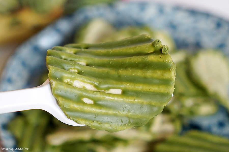 진한색의 말차 화이트 초콜릿이 감자 위에 두툼하게 코팅되어 있는 아름다운 모습입니다.. 먹기도 전부터 말차향이 상당히 진하게 나고요..