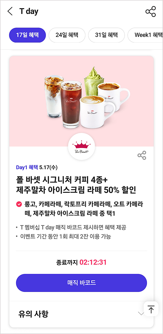 5월 T데이에 폴바셋이 참여한 관계로 어쩔 수 없이 폴바셋을 강제 방문하게 되었습니다.. 폴바셋 우주패스 플러스 구독이 출시되면서 T데이에 굳이 가야 하나 싶기도 한데.. 그래도 50%는 참을 수 없죠..