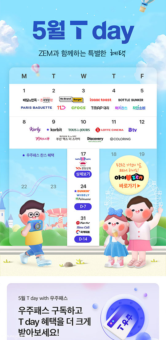 ZEM과 함께하는 특별한 혜택.. T멤버십 5월 T데이.. 5월 17일 혜택은 배스킨라빈스, 폴바셋, 광동상회..