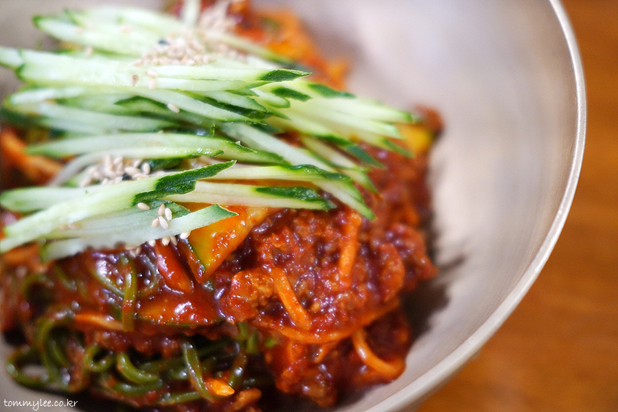 차가운 유기면기에 매우 차갑게 제공.. 온도부터 기본이 되어 있는 곳입니다.. 소복하게 올려진 오이채와 통깨.. 먹음직스러워 보이네요..