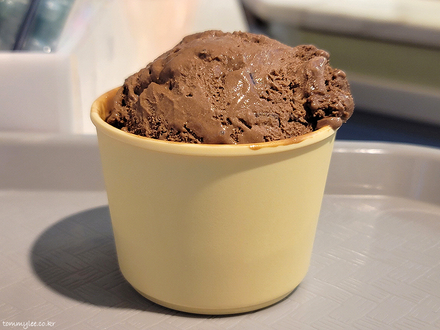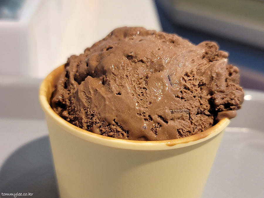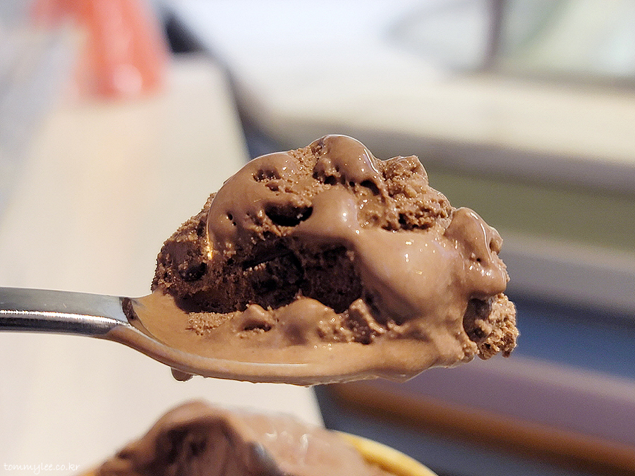 한 스푼 퍼올리면 이런 느낌.. 부드러운 초콜릿맛에 초콜릿칩 특유의 씹는 맛도 즐길 수 있어서 역시 맛있다는 생각이..