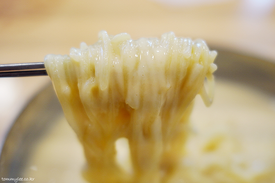 일단은 콩국맛부터 점검.. 되직한 진주회관 특유의 콩국물.. 이렇게 한 숟갈 퍼보기만 해도 일반적인 콩국수와는 다르다는 거 바로 느끼실 수 있겠고요..