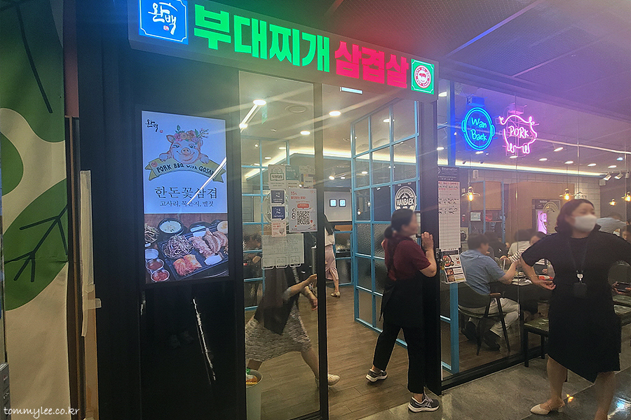 WANBAEK BUDAE JJIGAE SAMGYEOPSAL.. CITY HALL STATION CITY SQUARE.. 완백 부대찌개 삼겹살.. 시청역 씨티스퀘어점.. 영업시간은 10:00~22:00, 일요휴무..