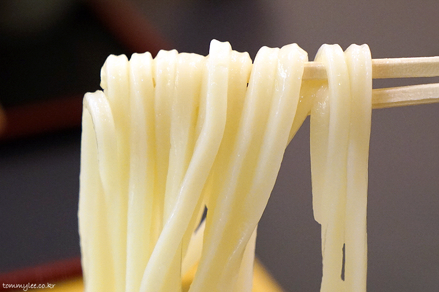 우동면을 들어 올리면 이런 느낌.. 면이 굵어서 많이 무겁네요.. 이 중량감 넘 사랑스럽다며 막.. ㅋㅋㅋ..