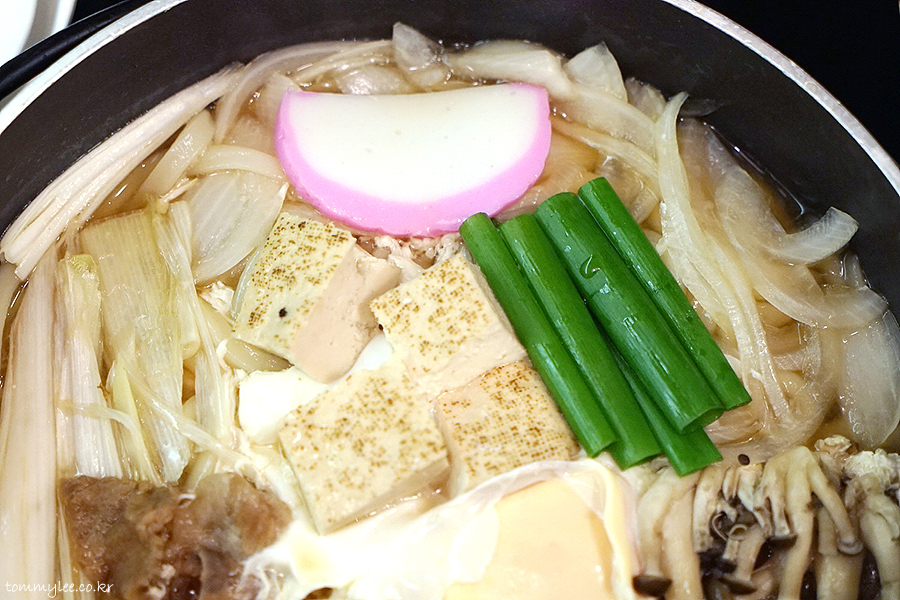 스키야키나베 우동을 위에서 바라보면 이런 느낌.. 스키야키고기랑 대파, 양파, 계란, 모멘두부, 시메지버섯에 카마보코까지 풍성풍성..