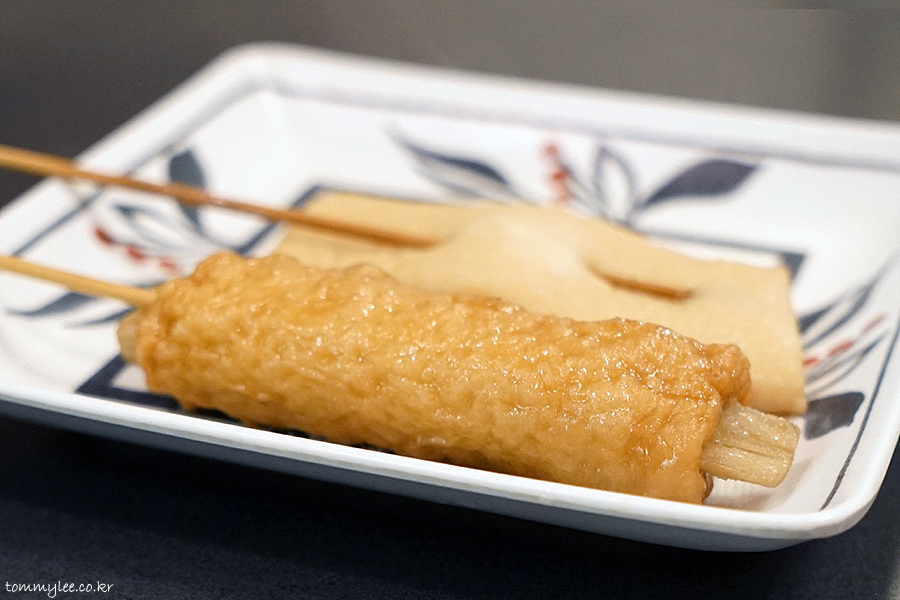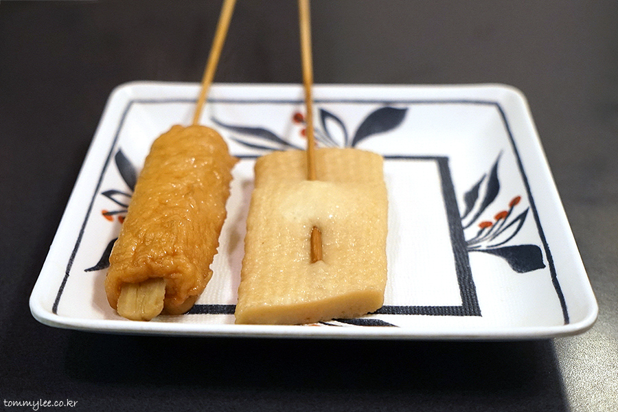 오뎅은 힘줄 들어간 꼬독이 오뎅 빼곤 100엔 균일가.. 우리에게 익숙한 어묵형 오뎅이 많아서 좋네요.. 같은 100엔인데 기왕이면 생선살이 들어간 게 이득이죠.. 전 아직도 다이콘 오뎅 같은 건 손이 안가요.. 무는 서비스인데.. ㅋㅋㅋ..