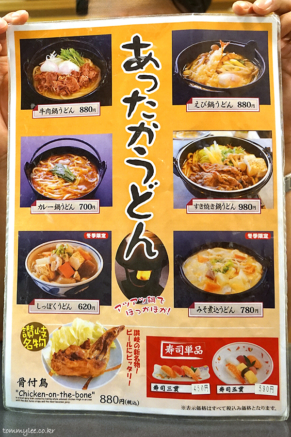 테우치(수타) 우동을 강조하고 있는 수타우동전문점 사누키면업(?)입니다.. 우동 가격은 300엔대부터니까 저렴한 편이고요.. 메뉴 가짓수가 많아서 선택의 폭이 넓고 메뉴판에 이렇게 사진이 다 있어서 주문하기도 편한.. 프랜차이즈이니만큼 영어메뉴도 아마 있을 것 같네요..