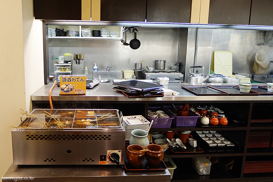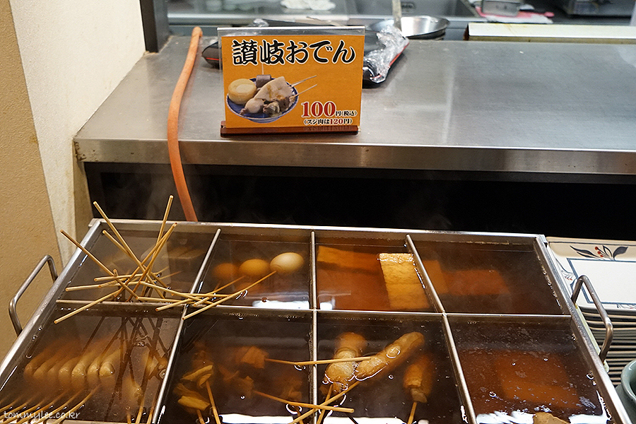 배가 매우 불렀지만.. 사누키 오뎅 체험을 안할 수는 없었습니다.. 오뎅은 오뎅바에서 직접 맘에 드는 오뎅 꼬치를 집어 접시에 담아서 자리로 가져오시면 됩니다.. 소스도 같이 가져오시는 게 포인트..