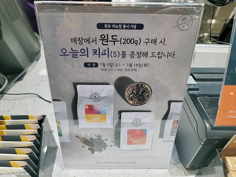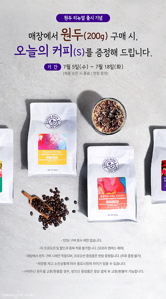 커피빈 원두 리뉴얼 출시기념으로 매장에서 원두 구매 시 오늘의커피를 증정하는 행사를 하고 있답니다.. 커피빈 멤버십 골드나 VVIP 회원이면 원두 구매 시 아메리카노 증정 혜택이 예전부터 있어 왔는데요.. 커피빈 멤버십이 등급을 받기가 많이 어렵습니다.. 콩적립 60개 해야 골드 멤버가 되니까.. 커피빈에서 커피만 마신다고 치면 무려 60잔을 마셔야 합니다.. 2달 동안 하루도 빠짐없이 출첵방문 해야 골드 등급이 될 수 있는 셈.. 커피빈을 매우 자주 가거나 푸드를 많이 먹거나 해야 합니다.. ㅡㅡㅋ.. 암튼 커피빈 비회원이나 핑크 듭급이신 분들은 원두를 구매해도 아무것도 받을 수가 없는데.. 이번 이벤트를 이용하면 구입 즉시 매장에서 바로 내린 드립커피를 제공받으실 수 있다고 합니다.. 이벤트 기간은 7월18일까지로 여유롭네요..