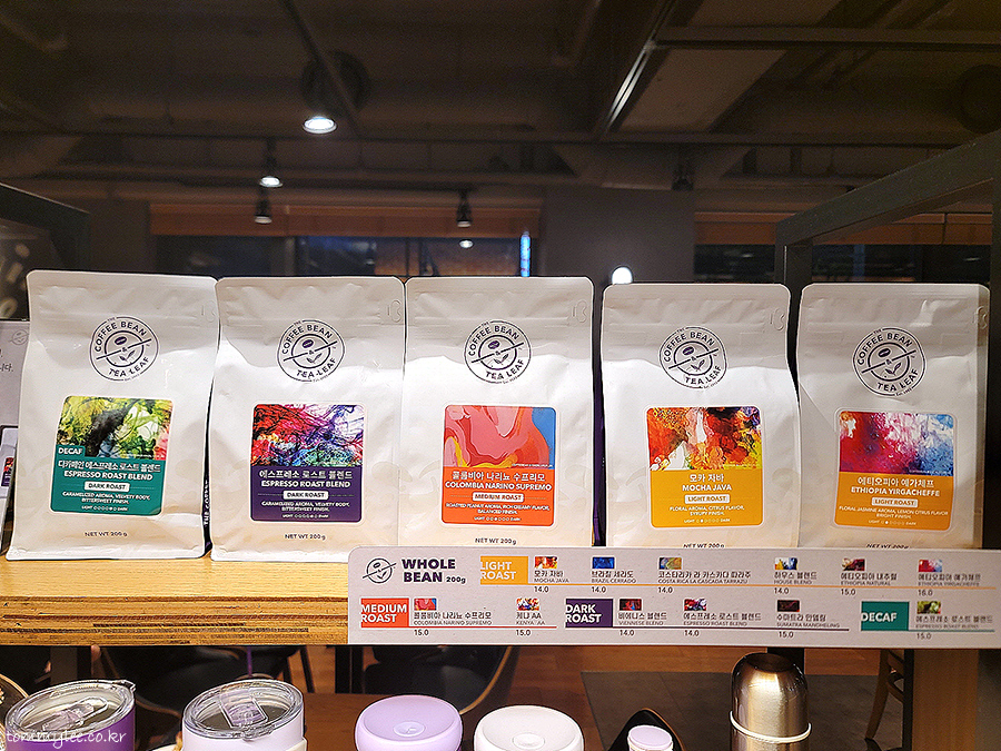 바로 원두 구입하러.. 요거이 커피빈 원두 신제품들이네요.. 왼쪽부터 디카페인 에스프레소 로스트 블렌드 15,000원, 에스프레소 로스트 블렌드 14,000원, 콜롬비아 나리뇨 수프리모 15,000원, 모카 자바 14,000원, 에티오피아 예가체프 16,000원.. 매장에는 이렇게 5종만 판매하고 있어서 살짝 실망스러웠어요.. 원두 판매가 워낙에 없는 매장이라 진짜 소극적으로 발주한 듯.. 에티오피아 내추럴 구입하려고 했는데 흠..