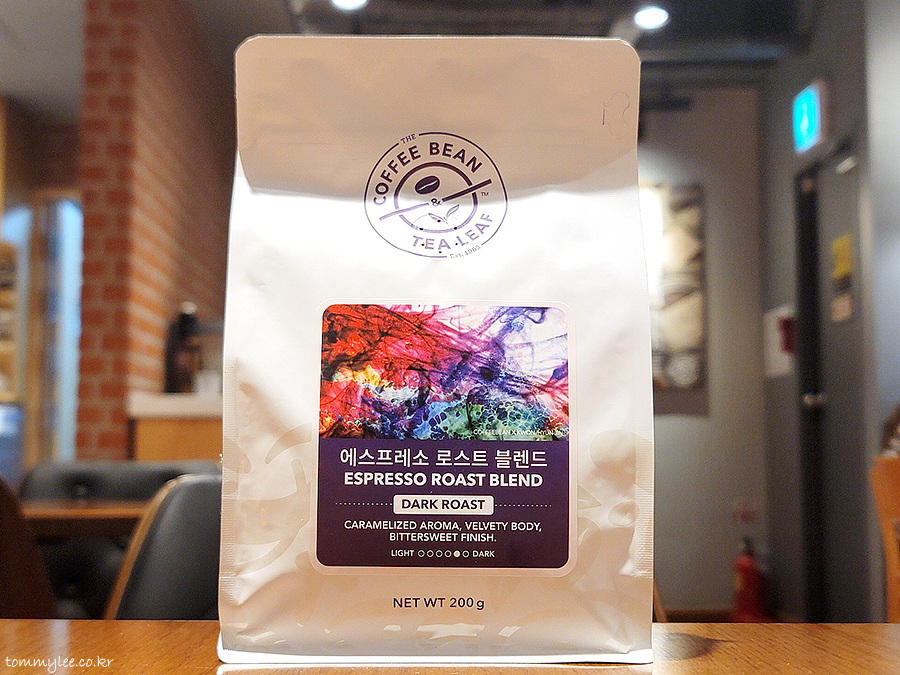 제품명 : 에스프레소 로스트 블렌드, 제조원 : 엠아이커피, 판매원 : 커피빈코리아, 내용량 : 200g, 원재료 : 커피원두 100%(브라질 30%, 과테말라 20%, 코스타리카 20% 외), 가격 : 14,000원.. MADE IN KOREA..