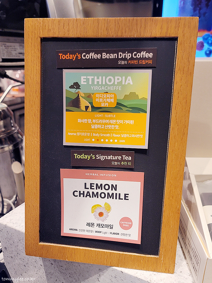 커피빈 원두 구매 시 누구나 받을 수 있는 오늘의커피.. 오늘의커피와 오늘의티 메뉴는 매일 바뀌는데, 보드에 이렇게 표시가 된답니다.. 오늘의 커피는 에티오피아 이르가체페 모카, 오늘의 차는 레몬 캐모마일이네요..