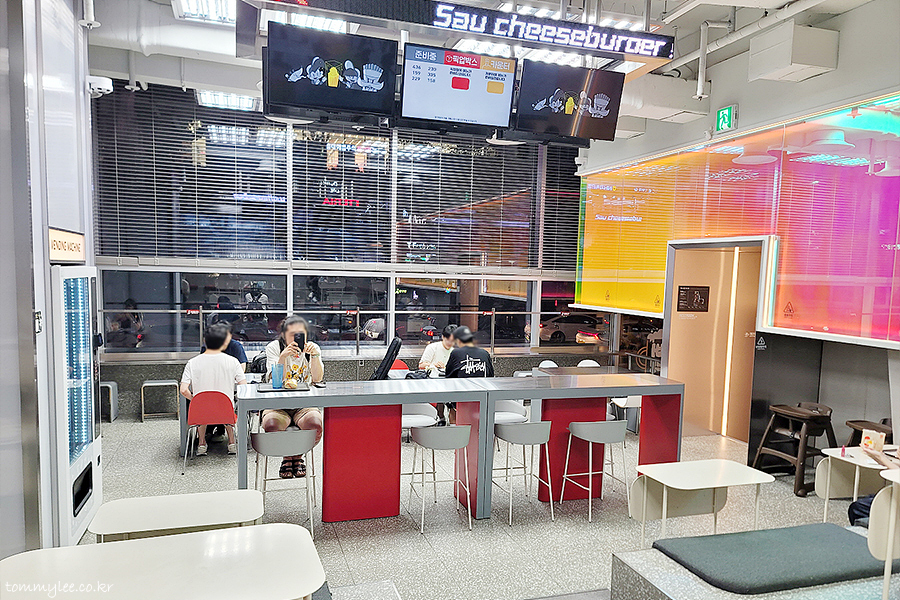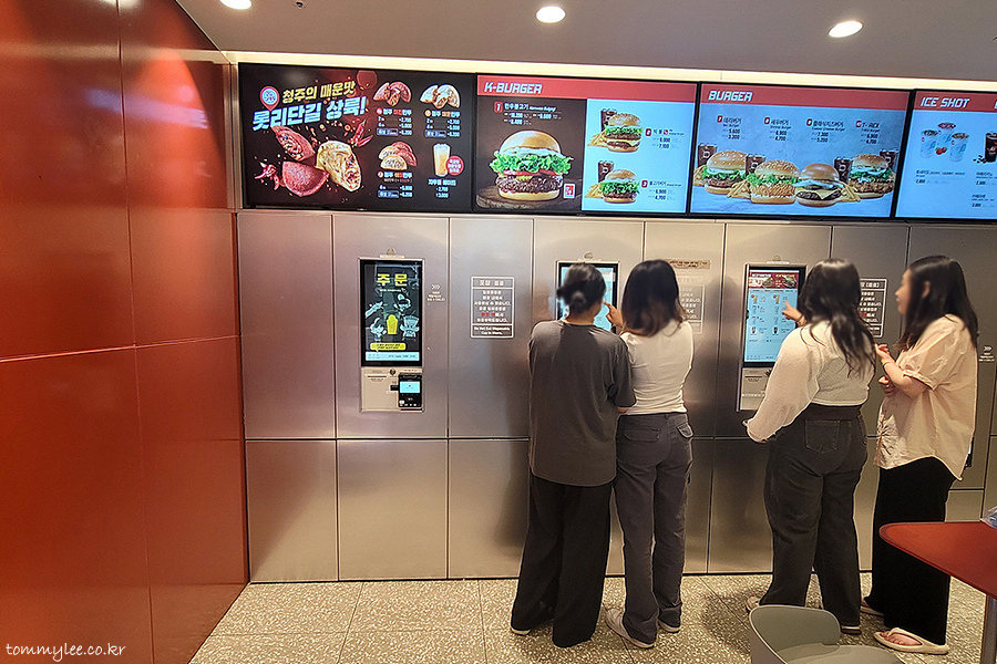 스태디엄식 구조를 하고 있는 롯데리아 홍대점의 모습.. 전광판에 픽업박스에 제품이 준비되었다고 번호가 뜨면 가지러 나가면 됩니다..