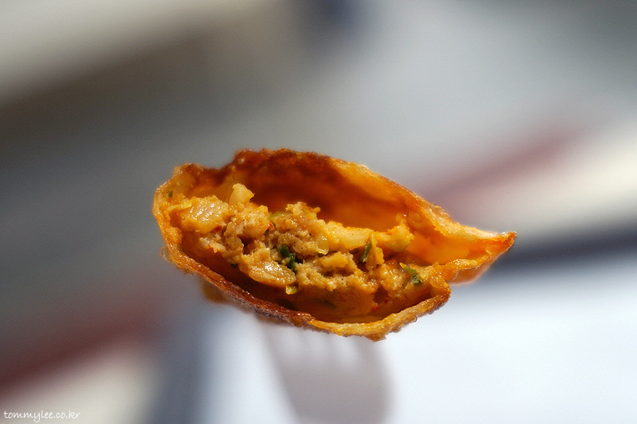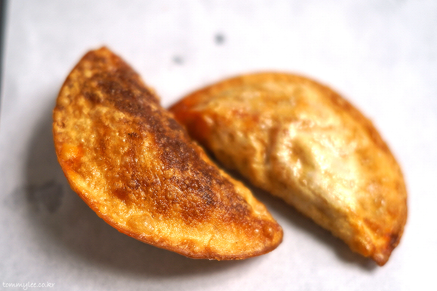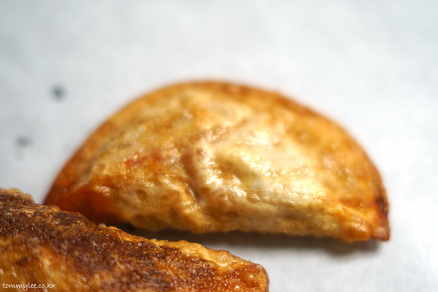 저는 저의 분수를 잘 알기 때문에 일반(?) 매운만두로 주문했습니다.. 보시다시피 반달모양의 군만두입니다.. 겉보기엔 하나도 안매워 보입니다만 이게 맵다는 거..