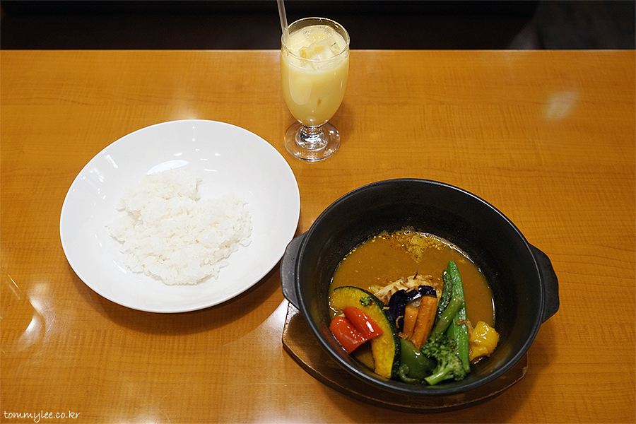 점심으로 삿포로에서 먹은 텐마 수프카레 사진.. 요거이 라씨까지 1,450엔.. 한국 돈으로 14,000원 정도고, 명가의뜰 콩비지찌개는 콜라까지 11,500원이거든요??.. 인천공항이 더 싸고 맛있었네요.. 반찬 나오는데서 포인트 업업업.. ㅋㅋㅋ..