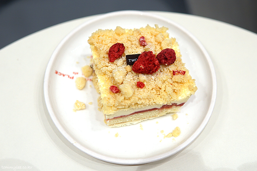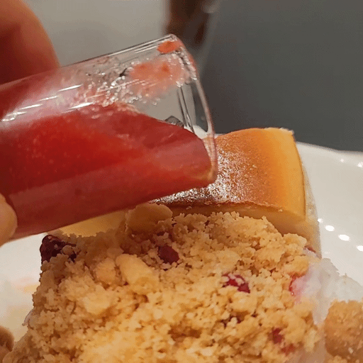 이렇게 크럼블과 치즈케이크 위에 딸기소스를 투하해주심 됩니다..
