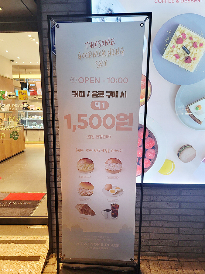 투썸 굿모닝세트.. 투썸모닝 시간은 오픈~10시까지이고.. 할인 내용은 커피 또는 음료 구매 시 모닝메뉴 1,500원 제공이네요.. 메뉴는 베리머치에그, 베리머치감자, 베리머치크랩, 반숙란, 크루아상 이렇게 5종.. 아침에 30분 일찍 일어나면 먹을 수 있긴 한데 과연 투썸모닝을 먹을 수 있을는지는 의문.. ㅡㅡㅋ..